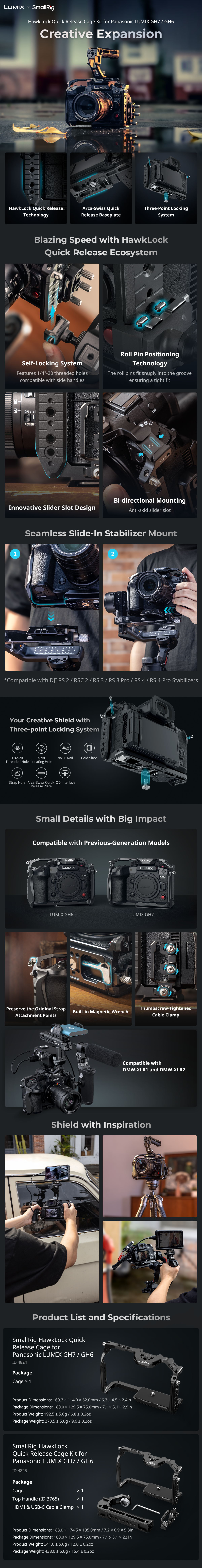 SmallRig HawkLock Quick Release Cage for Panasonic LUMIX GH7 / GH6 4824 is designed to provide accessory mounts and protect the camera. The patented self-developed quick-release structure (named HawkLock) covers cold shoes, NATO rail, and arca swiss, which is used with HawkLock eco-accessories to realize solid and no false position, one push to load, release to lock, and improve the disassembly efficiency. It locks the camera via one 1/4"-20 screw and the two M2.5 screws on both sides. Built-in all-around protective spacers prevent the camera from being scratched. The cage gives access to interfaces, dials, buttons, or battery doors. 1/4"-20 threaded holes, ARRI 3/8" -16 locating holes and HawkLock cold shoe mounts support top handle 3765, side handle 2093, monitor mount 2903, microphones, LED lights, monitors, etc. The bottom QD socket supports the QD shoulder strap. HawkLock Arca-Swiss quick-release plate at the bottom is compatible with DJI RS 2 / RSC 2 / RS 3 / RS 3 Pro / RS 4 / RS 4 Pro. Strap holes on the sides and bottom of the cage allow attaching such accessories as hand strap PAC2456. Besides, the cage comes with a built-in magnetic spanner that facilitates disassembly and assembly.